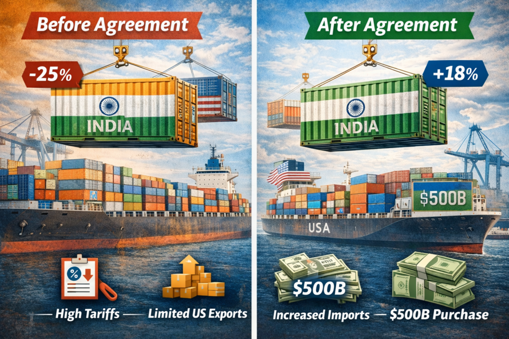 Key Facts Summary The United States reduced tariffs on Indian goods from 25% to 18%. India plans to purchase $500 billion worth of American energy, technology, and industrial products over the next five years. India agreed to reduce tariffs on several US industrial and agricultural products. Both countries are working toward a full Bilateral Trade Agreement (BTA). The deal aims to strengthen supply chains, technology cooperation, and economic security. What Is the India–US Trade Deal? In February 2026, India and the United States announced a framework for an interim trade agreement. This agreement is part of ongoing negotiations toward a broader Bilateral Trade Agreement between the two countries. The deal focuses on reducing tariffs, increasing trade, improving market access, and strengthening cooperation in key sectors such as energy, technology, agriculture, and manufacturing. The agreement reflects a shift toward deeper economic integration between two of the world’s largest economies. Background of Trade Relations Between India and United States India and the United States have steadily increased trade over the past two decades. The United States is one of India’s largest trading partners, and India is among the fastest-growing major economies for US exports. Which country is net importer or exporter? The United States currently runs a trade deficit with India. This means: India exports more goods to the US than it imports. The US imports pharmaceuticals, textiles, machinery, and IT-related goods from India. India imports energy products, aircraft, defense equipment, and agricultural products from the US. The US has been seeking to reduce this trade deficit through tariff adjustments and increased exports. What Changed in Tariffs Under the New Deal? Tariffs are taxes imposed on imported goods. Higher tariffs make imports more expensive, while lower tariffs encourage trade. Key tariff changes include: The United States reduced tariffs on Indian goods from 25% to 18%. The US plans to remove tariffs on selected products such as: Generic pharmaceuticals Aircraft parts Gems and diamonds India agreed to reduce tariffs on US exports including: Industrial goods Agricultural products Technology equipment This tariff reduction makes it easier and cheaper for both countries to trade. What is the $500 Billion Purchase Plan Explained. One of the most significant parts of the deal is India’s commitment to purchase $500 billion worth of US goods over five years. These purchases include: Energy products such as oil and LNG Aircraft and aviation equipment Technology products including data center components Coal and industrial materials Precious metals This commitment will significantly increase US exports while helping India secure reliable energy and advanced technology. Russian Oil and Strategic Economic Alignment The trade agreement also reflects broader economic and strategic cooperation between India and the United States. The United States has emphasized strengthening economic alignment, supply chain resilience, and technology cooperation. As part of broader economic discussions, both countries are working toward reducing trade imbalances and improving long-term economic stability. The focus of the agreement is economic cooperation rather than imposing restrictions, with both countries benefiting from increased trade and investment. Why Has India Not Fully Opened Its Agricultural Market? India has traditionally maintained higher protection for its agricultural sector from the history due to several key reasons. To Protection of Small and Marginal Farmers India has over 100 million small farmers who depend on agriculture for their livelihood. Sudden exposure to global competition could impact rural incomes. Small Farmers do agriculture for living. They can’t compete with the US Farmers due to several reason. What is the Impact of US Farm Subsidies to India Farmers? US farmers receive large government subsidies, allowing them to produce and export agricultural goods at lower prices. This creates strong competition for Indian farmers. This result that the price of Indian agriculture products are so expensive as compared to US agriculture goods, It will direct impact on farmers livelihood. Food Security and MSP System India’s Minimum Support Price (MSP) system ensures stable income for farmers and supports national food security. Opening markets too quickly could disrupt this system. What Are the Issues Surrounding GM Crops and Cotton Imports? India’s Regulatory Framework India has strict regulations on genetically modified crops. Only selected GM crops are approved, and imports must meet safety and regulatory standards. US Demands for Greater Market Access The United States has requested easier access for agricultural products, including GM crops and cotton. Quality and Tariff Standards Tariffs and regulatory standards ensure that imports meet domestic safety, environmental, and quality requirements. Why India Is Cautious About Allowing US GM Cotton Seeds ? India’s hesitation to allow wider access to US genetically modified (GM) cotton seeds is shaped by its past experience with foreign biotechnology companies, farmer economics, and export risks. In the early 2000s, when India’s cotton crops were severely affected by pests such as the bollworm, India approved Bt cotton technology developed by Monsanto, in partnership with Indian seed companies. Bt cotton contains a gene from the bacterium Bacillus thuringiensis, which helps the plant resist insect attacks and significantly improved cotton yields in India. However, this technology also led to concerns. Monsanto charged Indian seed companies a technology licensing fee (trait fee), which increased the cost of seeds. As a result, many farmers had to pay higher prices compared to traditional seeds. This became a major political and economic issue, and in 2016, the Indian government intervened and capped royalty fees to make seeds mo